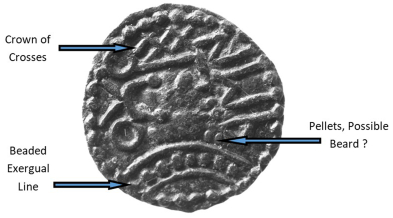 Nine of the coins had a crown above the head, eight of these were a three point crown, the remaining one had a two point crown. One coin, ID 2 had what looked like a three point crown which consisted of three X’s. On coins ID 11 and ID 16 it was not possible to positively identify the crown. Eight coins had what I have called a “crown line” only.